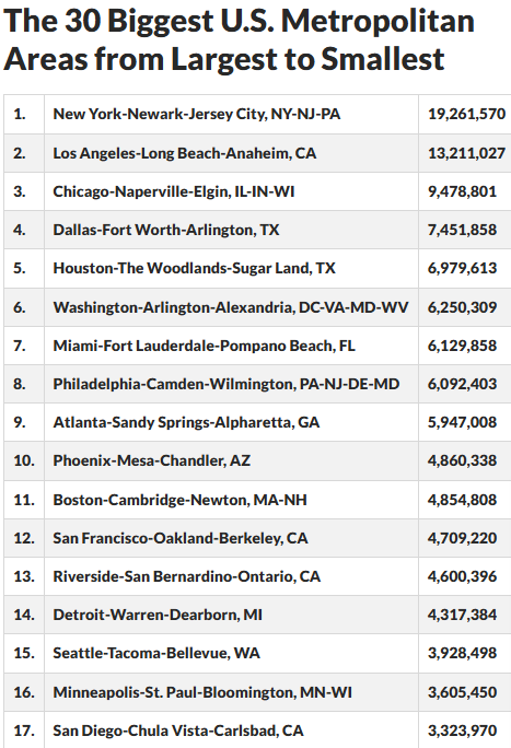 San Diego comprises the San Diego–Chula Vista–Carlsbad, CA Metropolitan Statistical Area, which is the 17th most populous metropolitan statistical area and the 18th most populous primary statistical area in the United States. Total MSA population of the 30 largest metro areas is 148,109,172 and for the first 17 is 115,002,511.